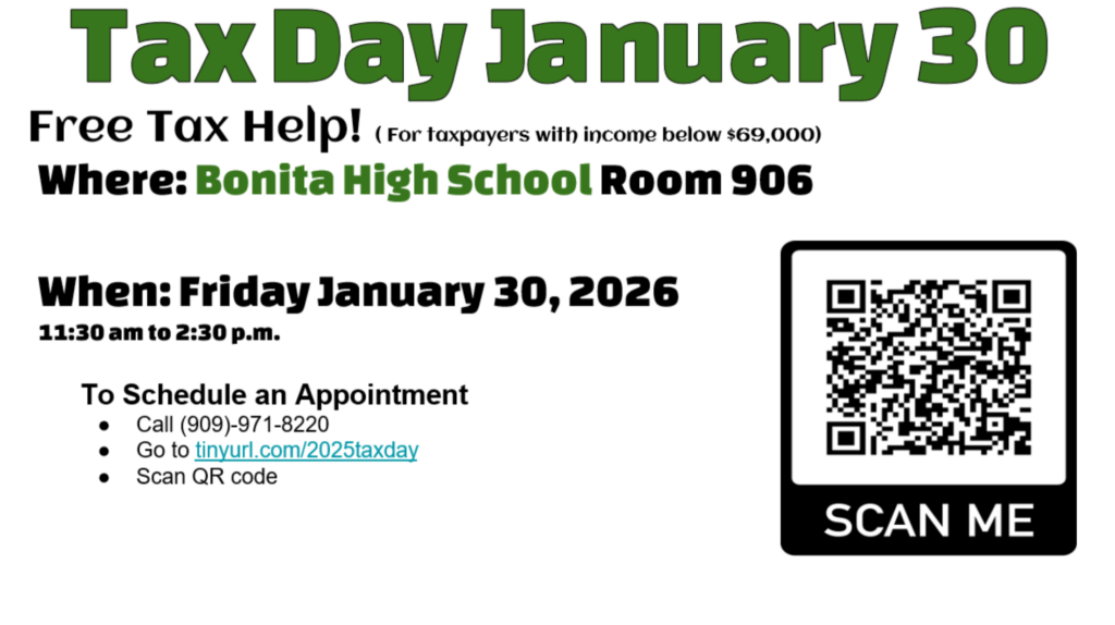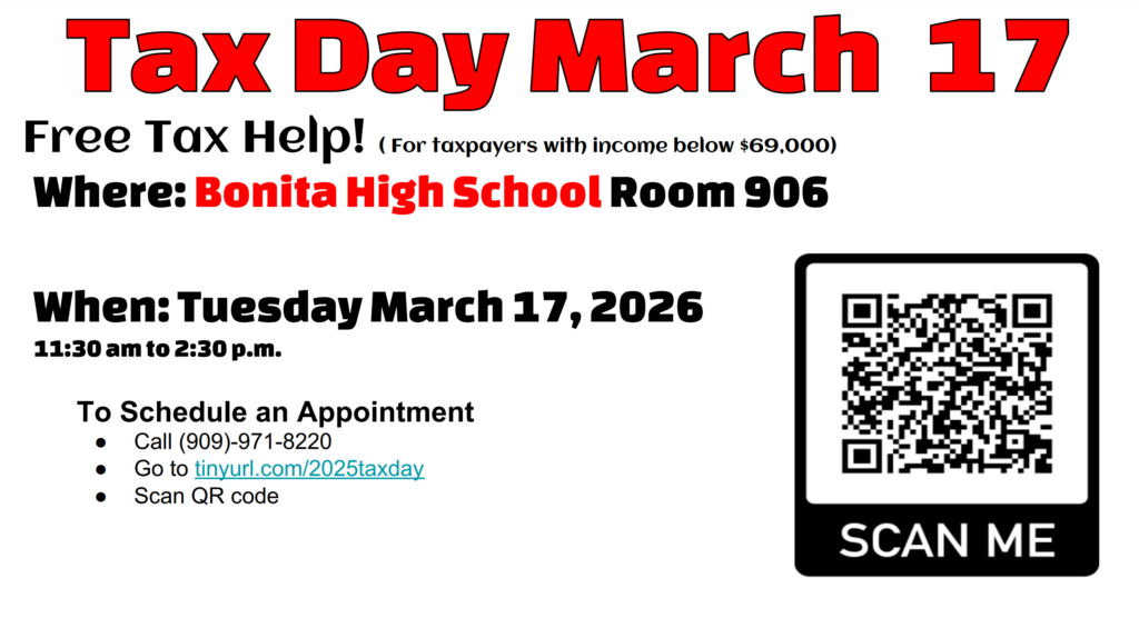 If you want an appointment, please sign up on the link provided on the Bonita web site under Tax Day or go to tinyurl.com/2025taxday /email Ms. Sekhri at m.sekhri@bonita.k12.ca.us or call 909-971-8220.